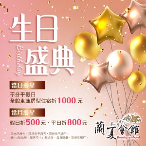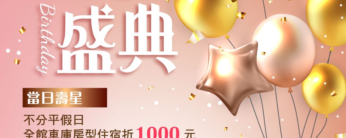 🎂當日壽星 不分平假日,全館車庫房型住宿折1000元。 🎂當月壽星 全館車庫房型住宿假日折500元、平日折800元。